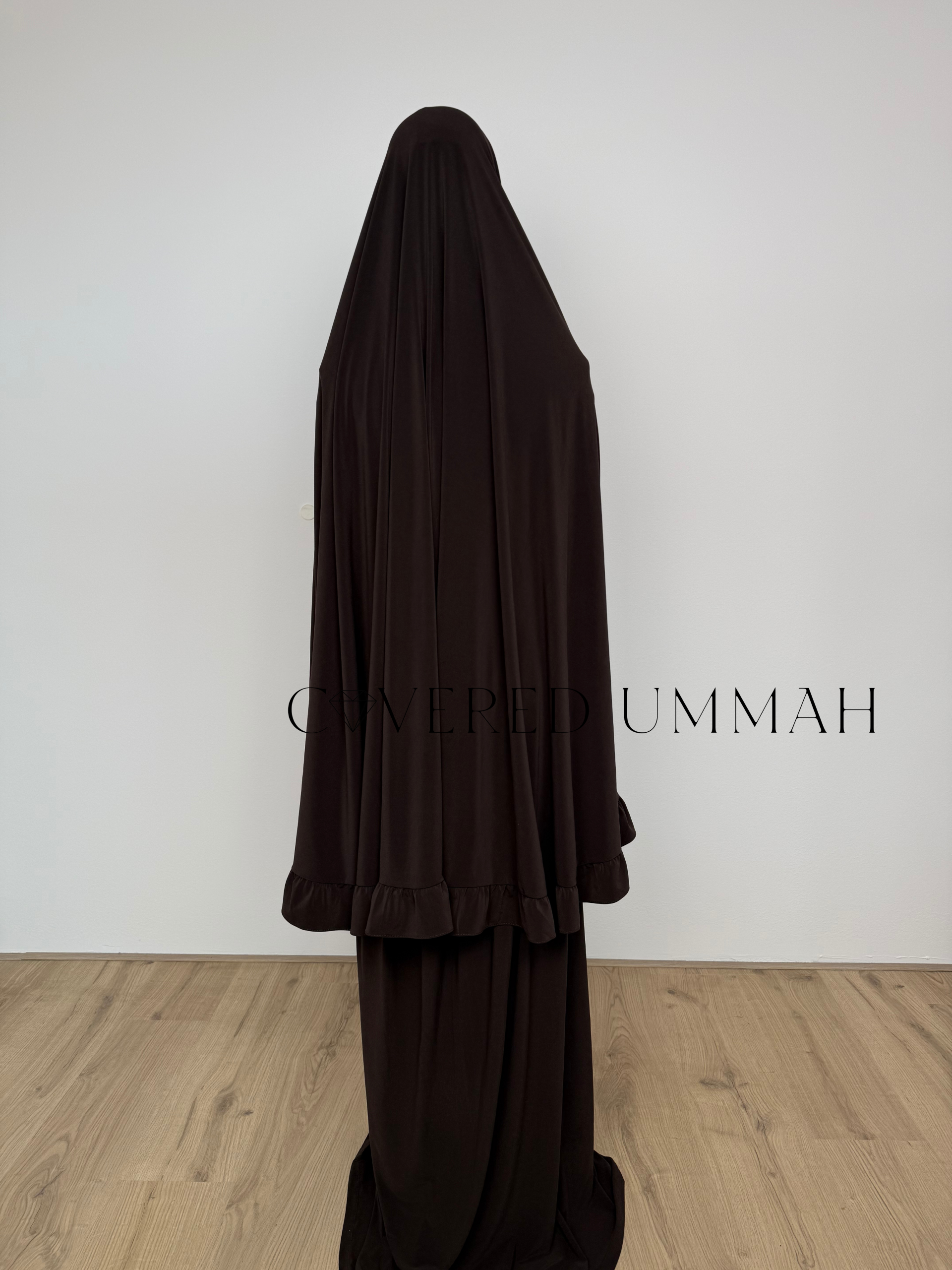 Premium Jersey Ruffle Khimaar & Rok Set ‘Dark Brown’